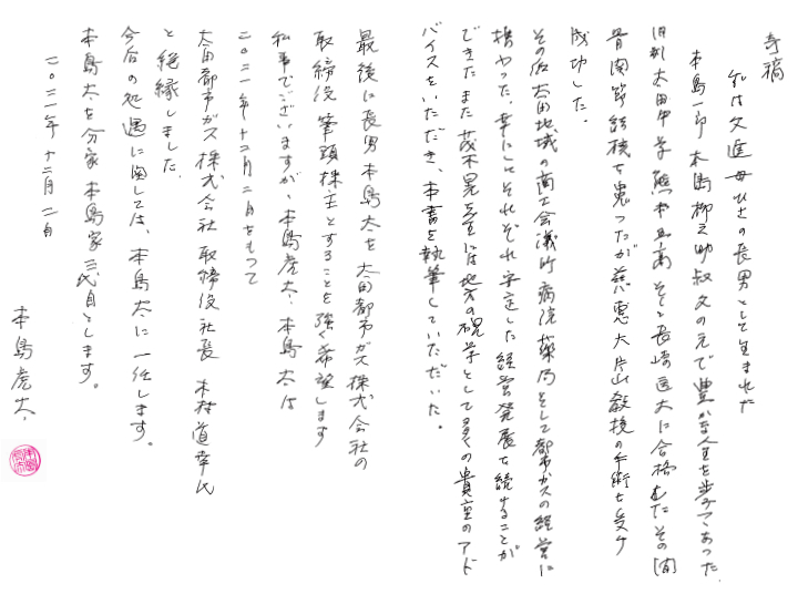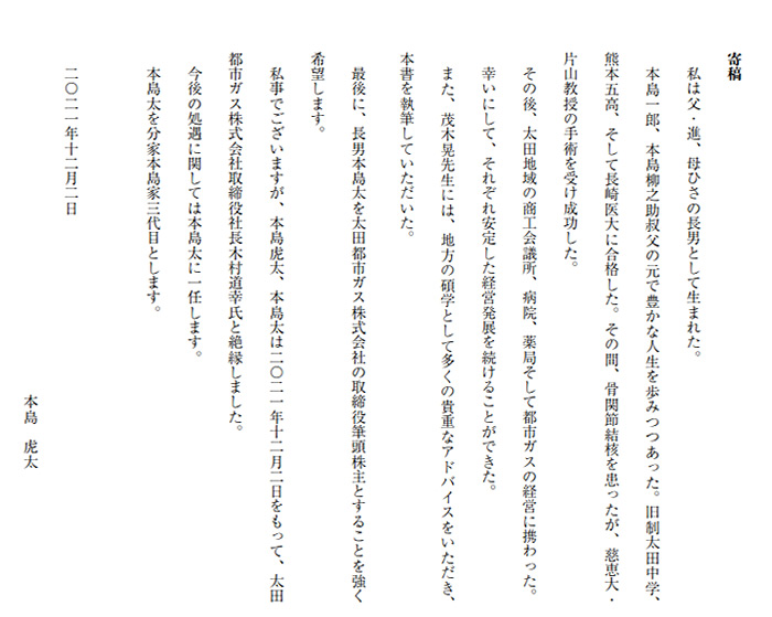 更に父より、本島太を太田都市ガス株式会社 取締役 筆頭株主とすることを強く希望していただき非常に感謝しております。
